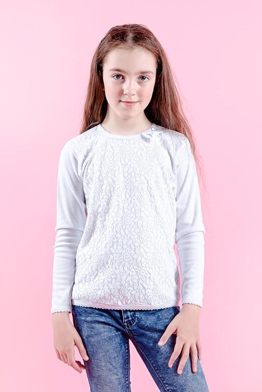 Блузка для дівчаток з довгим рукавом. Перед подвійною з гіпюром + декоративний бант з атласу На спинці по горловині застібка кнопка Полотно:фуликра вибілена спів + гіпюр ЗАМІРИ НА ОСТАННЬОМУ ФОТО Склад:95%х/б +5%лайкра Ціна залежить від розміру Розміри: 104-140см 56 104-110 35 40=95грн 60 116-122 38 42=110грн 64 122-128 40 44=115грн 68 128-134 43 46=120грн 72 140 45 48=130грн Є така ж з білим гіпюром Дивіться в моїх оголошеннях