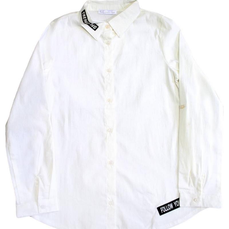 Универсальная стильная рубашка, которая прекрасно подойдет для школьных занятий, различных праздничных событий и для повседневных образов. Модель молочного цвета, снизу и на воротнику украшена надписью, спереди застегивается на пуговицы.