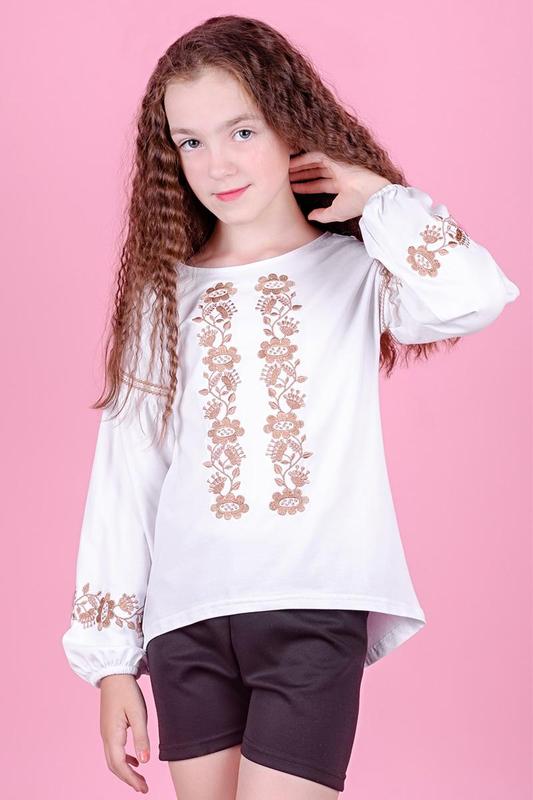 Вишиванка для дівчаток-підлітків. ➪ Виріб з довгим, цільнокроєним рукавом. ➪ Низ рукава призібраний з допомогою еластичної тасьми. ➪ Горловина кругла. ➪ Красива вишивка прикрашає рукави і перед вироби.