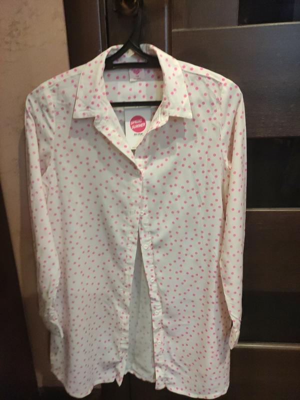 Біла в білі-рожеву крапочку. Великомірить, напевно десь на 162-168 зріст.