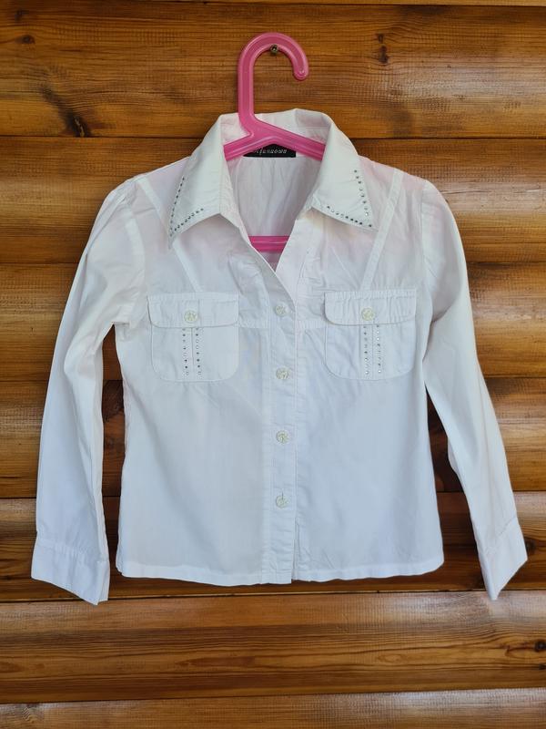 Рубашка с стразовым декором р.122 на девочку 7 лет без дефектов в отличном состоянии Замеры: длина - 43см рукав от плеч.шва - 42см ПОГ - 35см