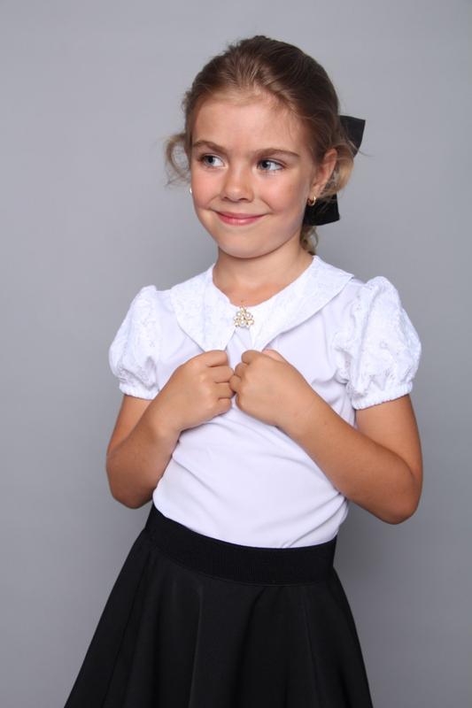 Отличная белая блузка из качественной ткани софт и мягкого кружева. Благодаря кружевом воротнику и рукавам- фонарикам, блузка отлично подойдёт и под юбку и под сарафан. Замеры Р. 122 пог 34 см, длина по спинке 44 см В наличии размеры 122
