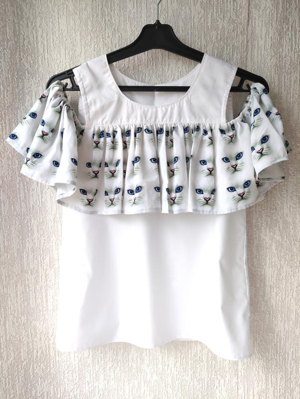 Блуза hand made на возраст примерно 10-12лет Хлопок (не тянется) рубашечная ткань. Волан с котиками, рисунок не смывается! * Замеры: длина 56см. от подмышки до подмышки 40см. ширина внизу 46см. длина волана 17см.