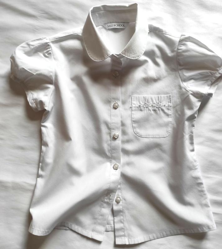 Шкільна блуза M&S на дівчинку 6-7 років у хорошому стані. Заміри-довжина-43 см, ширина під рукавами-35 см,ширина плечей-28 см, довжина рукавчика-11