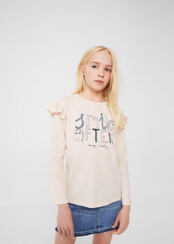 Реглан/лонгслів для дівчинки/трикотаж MANGO на 5-6 років на р.116. Тканина бавовняна. Проштамповано на лицьовій стороні. Прикрашений блискітками. Кругла шия. Деталь з оборками. Довгі рукави. СКЛАД: 100% БАВОВНА.