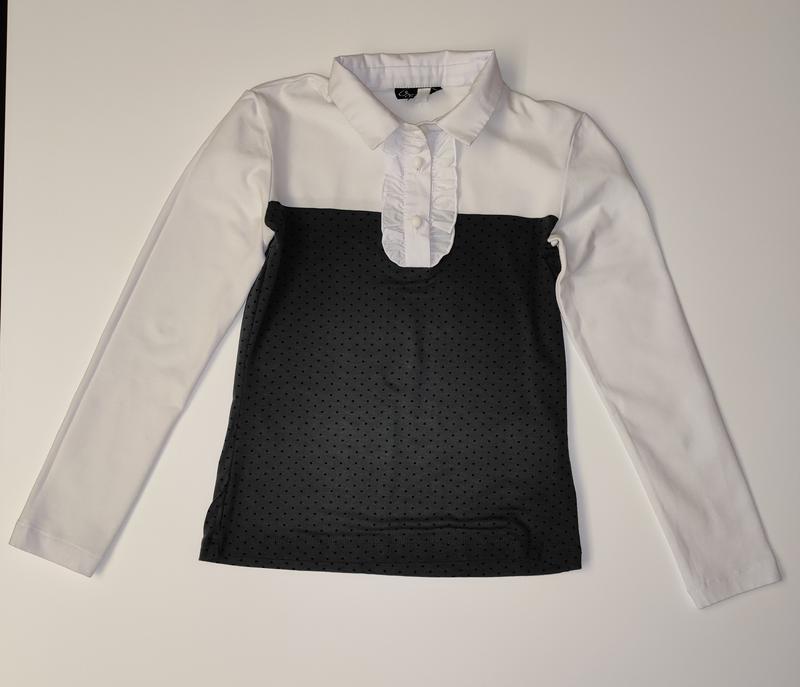 Блуза на дівчинку, б\у стан ідеальний, колір білий та сірий в чорну крапочку, розір - 140. Бренд - Sasha.