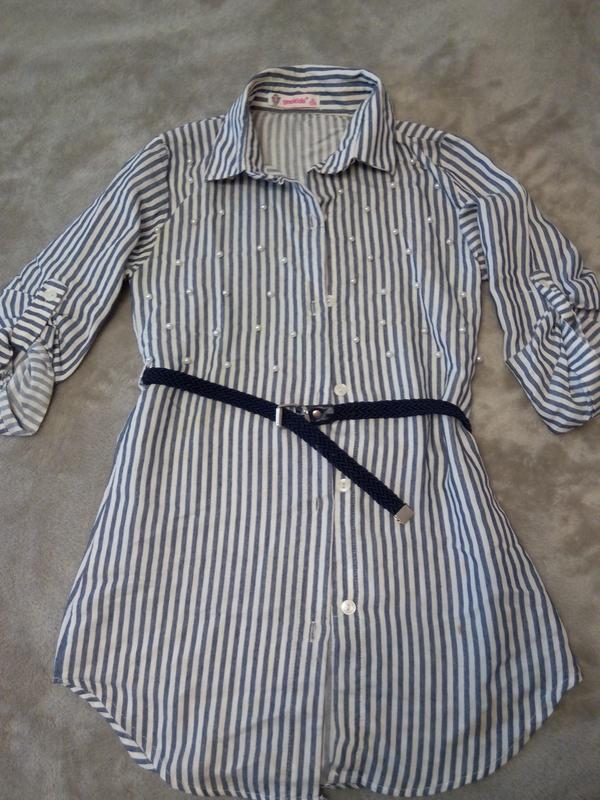 Гарна стильна тунічка. Можна носити як платячко і як тунічку під лосінчики. Бавовна. Дорога річ. Куплена в фірменому магазині. Оздоблена бусінками. Йде поясочок. Річ суперова. Одягалася 2 рази на свято. Рукавчик робиться в 3/4. можна і довший. На вік від 8-10 років. Всі заміри по бажанню. Заміри: Розмір вказаний 128 на 8 років. Довжина від плеча-65, рукав-40 ( повний) ширина від підмишки до підмишки-35, по таліі-35