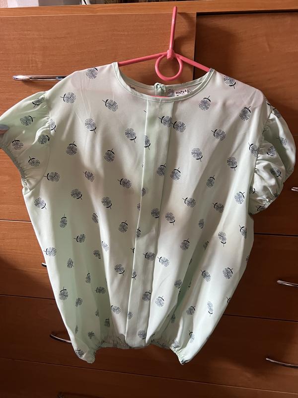 Дівчача блузка, в світло бірюзовому кольорі, з квіточками, низ та рукава на резинці, одягалась лише раз. На 12 років, матеріал акрил