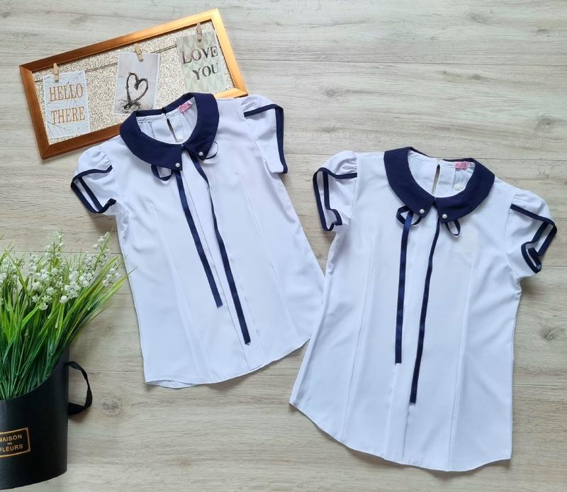 Шкільна блузочка Тканина-софт+кружево колір білий ззаді на гудзику Виробник Україна 140(1 шт)-довжина від плеча 47,пог 37 146(2 шт)-довжина від плеча 50,пог 38 152(1 шт)-довжина від плеча 53,пог 39