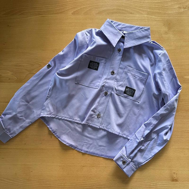Стильна блуза- відмінної якості. Спереду- вкорочена. Низ- асиметричний. Застібки- ґудзики, дві кишені. Написи- накат! Тканина -шифон. Розміри: 122 – довжина спреду 34, сзаду 41 см, рукав 48 128 – довжина спреду 36, сзаду 43 см, рукав 49 134 – довжина спреду 37, сзаду 44 см, рукав 51 140 – довжина спреду 38, сзаду 48 см, рукав 54 146 – довжина спреду 42, сзаду 49 см, рукав 56 152 – довжина спреду 43, сзаду 52 см, рукав 58 158 – довжина спреду 45, сзаду 53 см, рукав 61 164 – довжина спреду 47, сзаду 55 см, рукав 63 Ціна: 425 грн