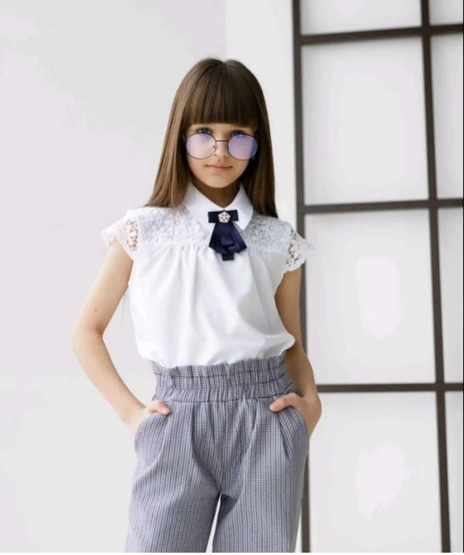 Шкільна блузка з легкої тканини шифон та мереживо. Брошка знімається на булавці. Заміри: розмір 122 см ширина плечей 29 см напівобхват грудей 36 см довжина від плечей 44 см розмір 128 см ширина плечей 31 см напівобхват грудей 36 см довжина від плеча 44 см розмір 134 см ширина плечей 31 см напівобхват грудей 38 см довжина від плеча 47 см