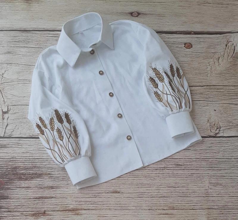 Сорочка для дівчат. На рукавах вишивка. Застібається на гудзики, крій вільний. Тканина - льон, приємна до тіла. Заміри: 122 довжина - 49см, напівобхват грудей - 40см, рукав від горловини - 51см. 128 довжина - 52см, напівобхват грудей - 42см, рукав від горловини - 54см. 134 довжина - 54см, напівобхват грудей - 43см, рукав від горловини - 56см. 140 довжина - 56см, напівобхват грудей - 44см, рукав від горловини - 58см. 146 довжина - 57см, напівобхват грудей - 46см, рукав від горловини - 60см. Розміри в наявності: 122-3шт 128-3шт 134-2шт 140-2шт 146-2шт Арт Сті