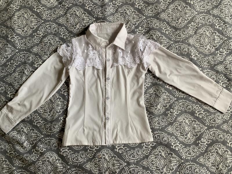 Дитяча блузка з мереживом, підходить як для свят так і для школи. На плечах прозорі мереживні вставки що придає ще більш святкового вигляду, гарно лягає на фігуру дівчинки. Стан ідеальний.