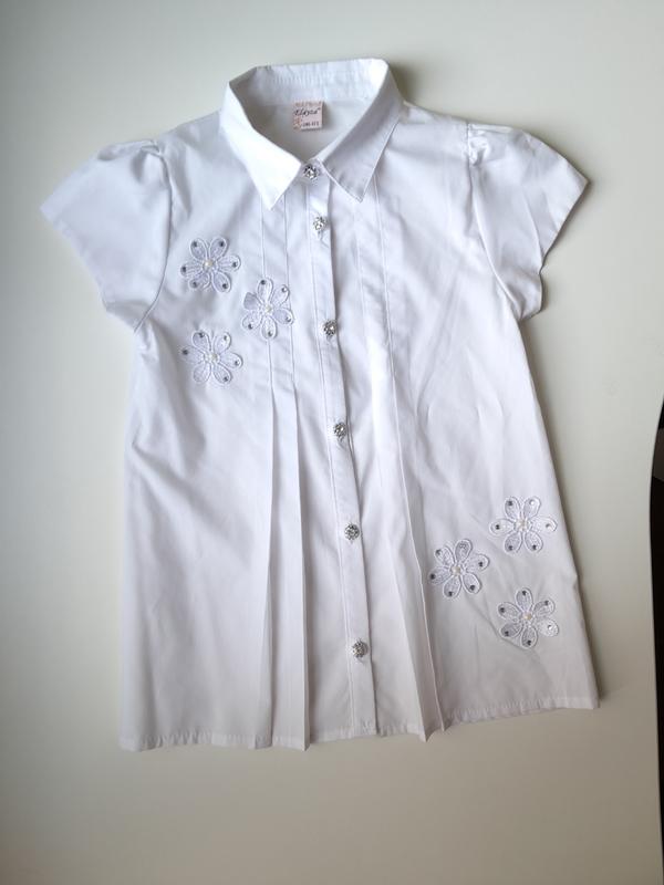 Блузка білого кольору короткий рукав в ідеалі. Застібається на ґудзиках, з коміром, є аплікації з квітів. Заміри довжина 51, грудях 35 см