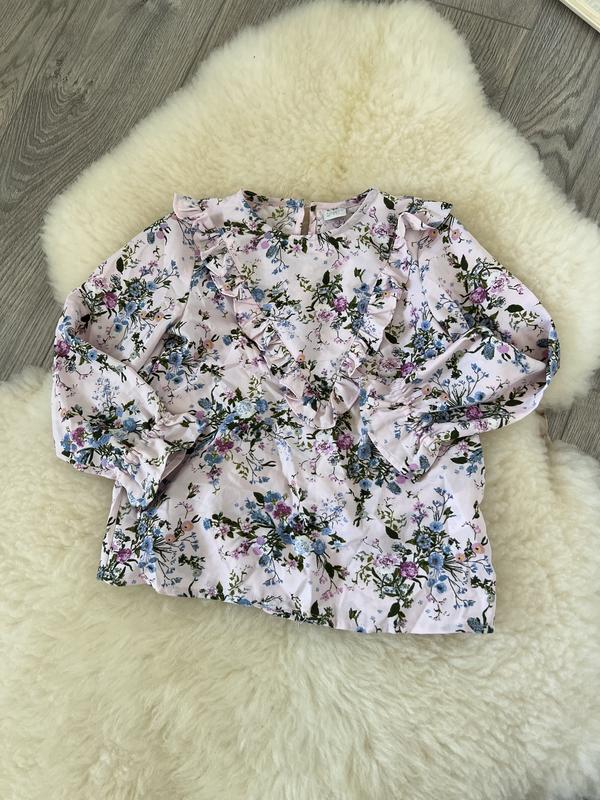 Рожева блузка з квітковим принтом та воланами. Вона має довгі рукави з манжетами на резинці та декоративні оборки на грудях7