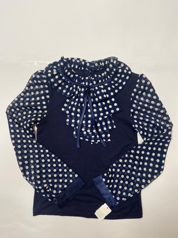 -колі сині,горох - розмір 8-9 років(зріст 134 см) -ліф темно-синій(віскоза);рукава і жабо- шифон. - заміри:плече 7,5 см;рукав с манжетом 49 см; груди 62 см;довжина блузи 43,5 см