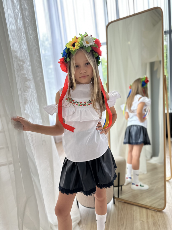 Біла блуза з імітацією етнічної вишивки. Сзаду- на застібці. Відмінна якість! Малюнок- термонакат! Тканина – бавовна, котон. Розміри: 116 – довжина 40 см 122 – довжина 42 см