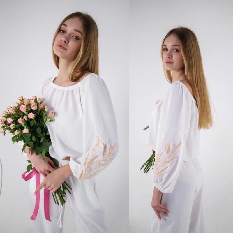 Таня арт 3576 Супер популярна вишивка колоски на трендовій блузі з американського крепу Супер якість ПОВНОМІРНІ зріст/довж. посередині/пог/рукав похибка+-2см 140-146/31/42/41-4шт 146-152/32/45/45-4шт 152-158/35/46/47-2шт 164-170/39/48/52-4шт