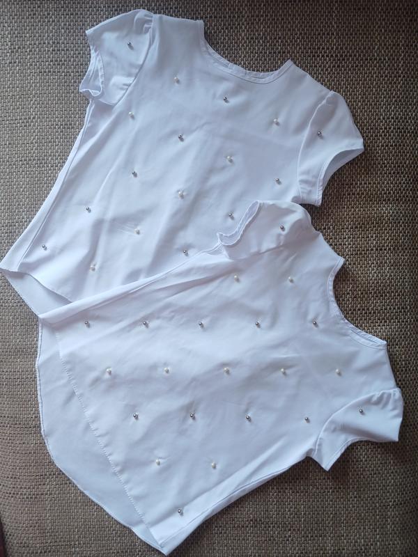 Блуза (футболка) для дівчаток близняток на ріст 128 см. Стан ідеальний, бусинки на заклепках, тканина не парить, не кошлатиться, ззаду подовжена.