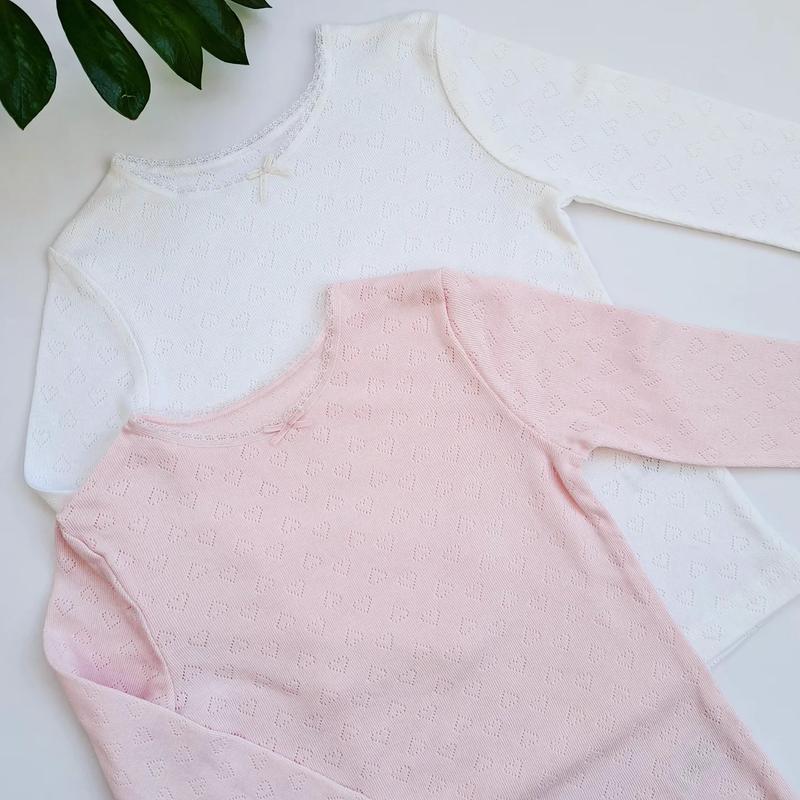 Ніжний топ для дівчинки з легкою перфорацією у вигляді сердечка. Круглий виріз оздоблений мереживною обробкою з бантиком. 👉Кольори: білий, пудра. 📏Розмір 104-110 (4-5років) Заміри: 💫довжина - 41 см 💫ширина - 28 см 💫рукавчик (від плеча) - 38 см.