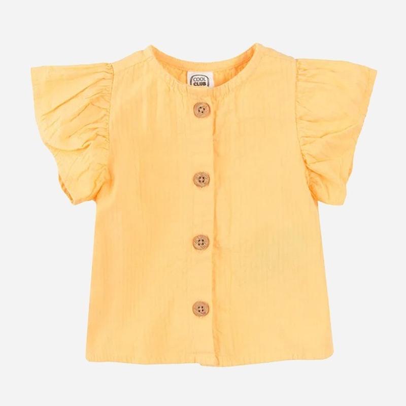 Яркая летняя блузка оранжевого цвета. Имеет воланы вместо рукавов, что придает ей изюминку. Застегивается спереди на крупные пуговицы. Очень легкий материал, нежная и приятная к телу! То что нужно в жаркую погоду От cool club Размер 86