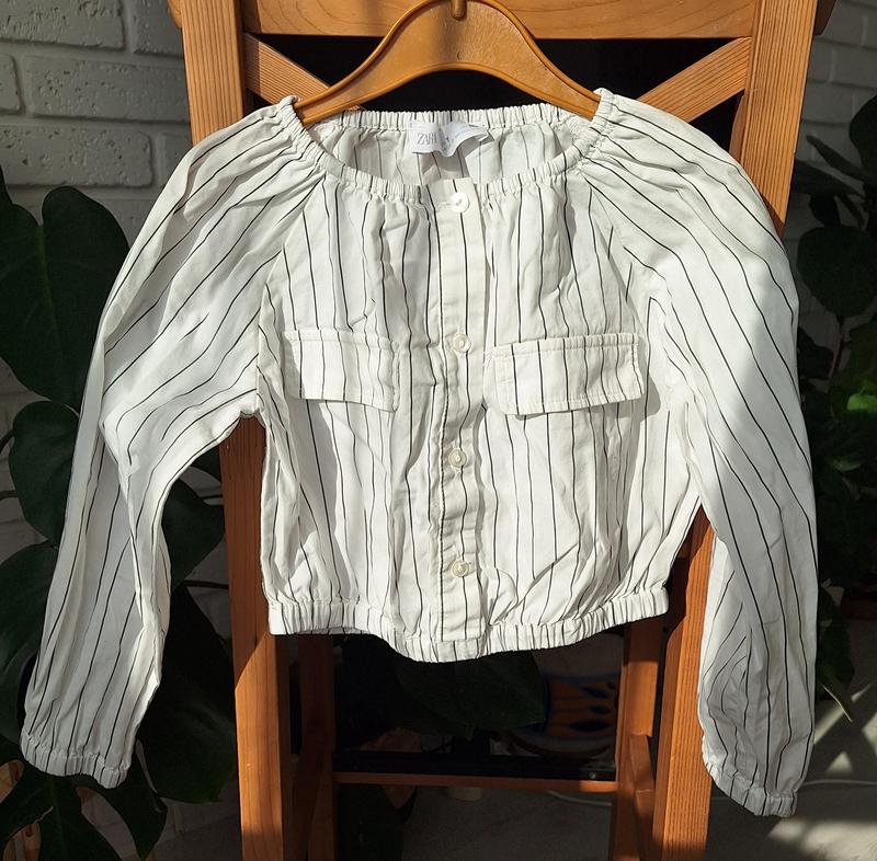 Укорочена блуза-топ, натуральна тканина. Легкая, удобно надевать ребенку. Состояние новой Длина 29, ширина по нижней резинке 27, рукав от шеи 45- широкий вырез