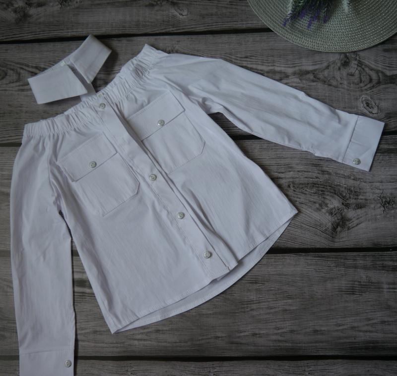 Рубашка для девочки со съемным воротником-чокером. Спереди накладные карманы. Застегивается на пуговицы. Ткань - стрейч-коттон. Мягкая, приятная к телу, тянется. Цвет-белый. Производитель - Украина. РЕКОМЕНДУЮ! Замеры: (рукав от самого верха, длина по переду ) 134 - длина - 42см, полуобхват груди -41см., рукав- 49см.