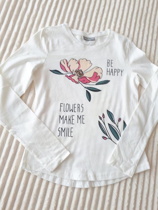 Реглани для дічинки з довгим рукавом DESTINATION. Один - білий з малюнком квітів , другий -без малюнку, колір морської хвилі. Матеріал: 98% бавовна, 2% еластан, м,який приємний на дотик. Розмір: EURO 146-152 см, 10-11 років Стан: новий, є один маленький дефект, залишилась маленька дирочка на спині, коли відривали етикетку( останнє фото).Етикетку відірвали, але реглани не вдягали .