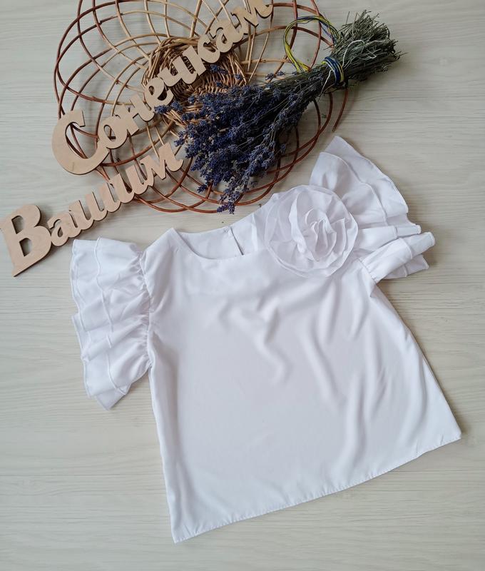 стильна блузка тканина супер софт, оброблена подвійною рюшею, на спинці є гудзик спереду прикрашена квіткою( пришита) колір білий заміри: довжина , ширина, см 116: 36см/35см 122: 37см/36см 128: 40см/37.5см 134: 44см/39см заміри вручну допустимо+-1,5см