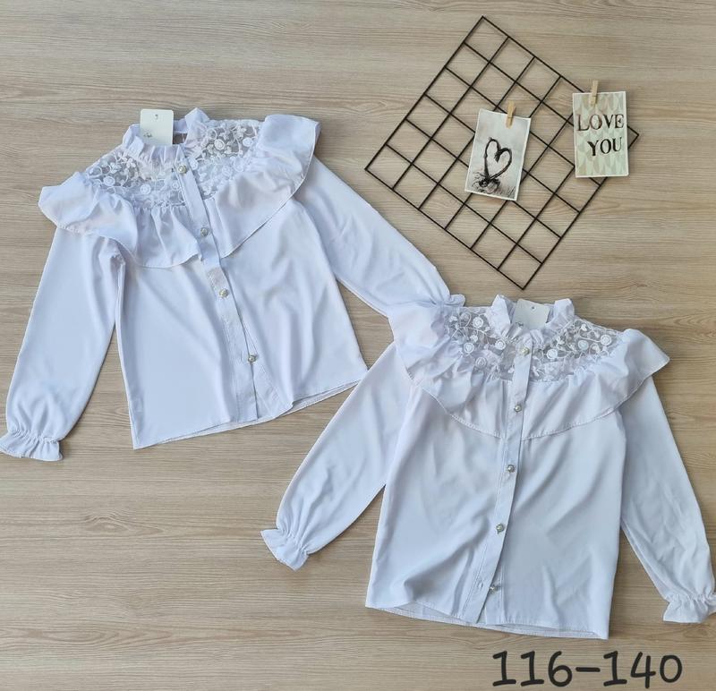 Шкільна блузочка тканина софт оздоблена красивим мереживом Рекомендую!!! 116(1 шт)-довжина блузи- 38,довжина рукава від плеча-40,пог-32