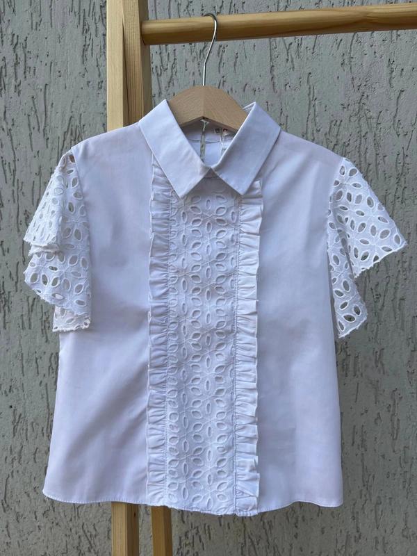Блуза для дівчат. Рубашечний стрейч поплін - 97% бавовна - 3 % еластан 🧶Прошва ( 100 % Котон) ✔️Крій напівприлеглого силуету ✔️Рукав- крилишко та вставка на пілочці виконані з прошви ✔️Горловина - стійка з відкладним коміром ✔️Центральна застібка на два ґудзика біля горловини на спинці ✔️Розміри повномірні 🎨колір : білий Якість бомбезна! Заміри: 122 довжина - 40см, напівобхват грудей - 33см. 128 довжина - 42см, напівобхват грудей - 34см. 134 довжина - 44см, напівобхват грудей - 36см. 140 довжина - 46см, напівобхват грудей - 37см. 146 довжина - 47см, напівобхват грудей - 39см. 152 довжина - 50см, напівобхват грудей - 40см. Розміри в наявності: 128-1шт 140-1шт 146-1шт арт мод