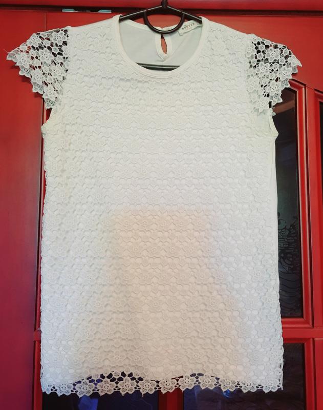 Ошатна біла кофтинка спереду з набивного мережива (перед з підкладом -непрозорий), рукавчик - мереживні крильця. Спина- трикотажна гладка. На дівчинку 9-12 років. Туреччина, якісна тканина. Ширина в грудях-38см, знизу-40см. Довжина -55см. Від плеча до плеча-31см, плечіко-9см. Пересилаю після оплати на мою картку.
