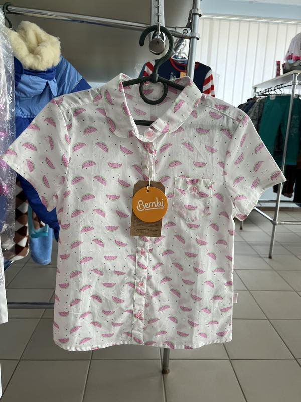 Біла блузка для дівчинки з принтом кавунчиків ,з коротким рукавом і комірцем ,має передню кишеню