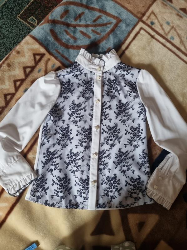 Блузка в ідеальному стані, не світиться, гарної якості, відомого дитячого бренду Заміри Довжина по спинці 47 см Ширина під мишками 38 см Довжина рукава 49 см з манжетом, манжет 8 см Плечі 30 см