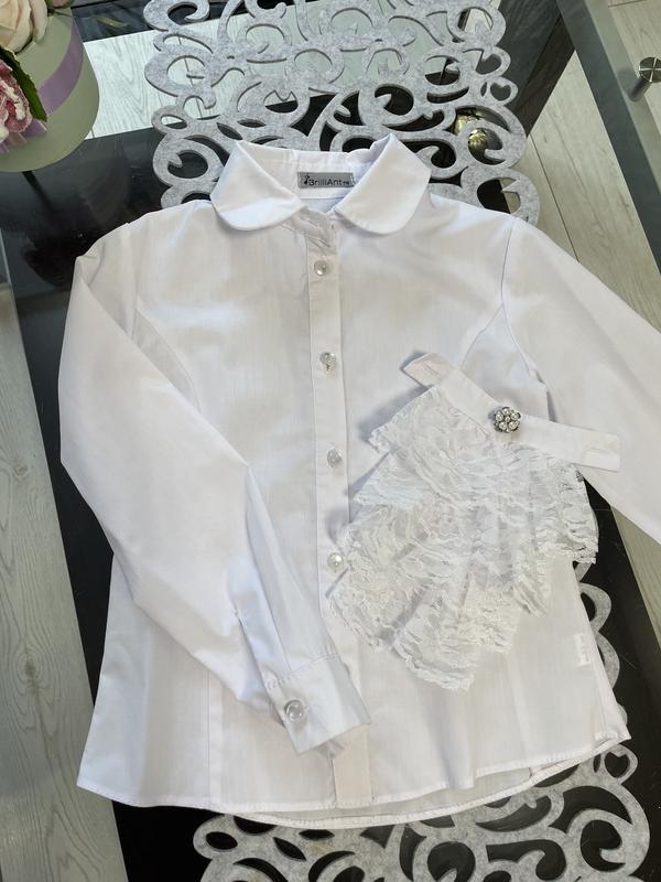 Біла блуза з мереживним жабо і брошкою, які відщібаються. Блуза у відмінному стані, стан нової. Одягалася декілька раз. Класної якості. На ріст-116см Довжина спинки -43см Довжина рукава від плеча -42см ПОГ- 33см Ширина плечей -29см