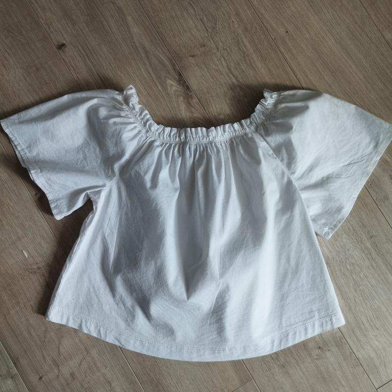 Білосніжна бавовняна блуза. Одягли лише 2 рази. В ідеальному стані. Крой вільний, на плечах резинка. Довжина 36см, ПОГ під руками 35см, ширина низ 44см, рукав довжина 18см, ширина 20см. В моєму профілі є ще багато шкільного одягу