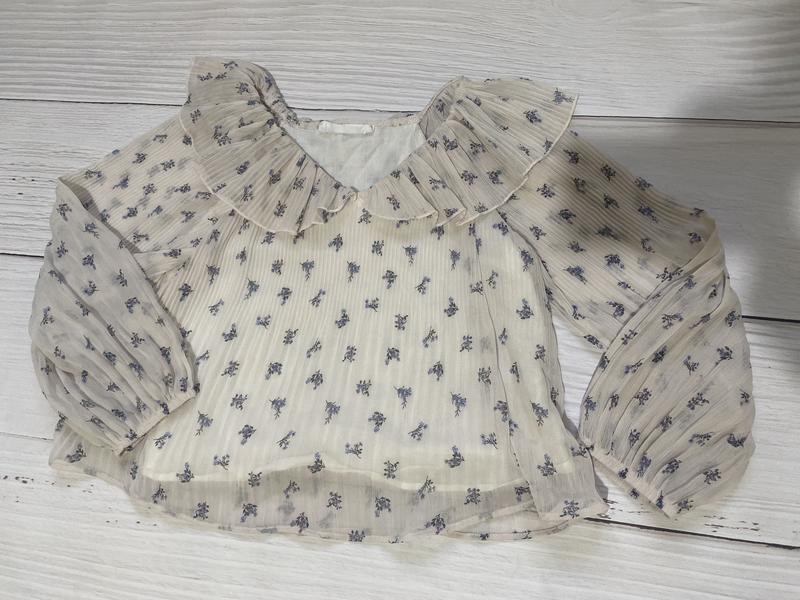 Красива легка блузка.З злегка спущеним коміром.8 років(128 р) Укорочена. Вільний крій. Шифонова.Рукава-ліхтарики. Під низом хб підкладка (не просвічуватися) Стан-ідеальний. Заміри: довжина 43. Рукав (від плеча) 51, може носитися як укорочений рукав. ОГ 39