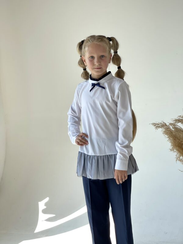 Стильна, модна шифонова блузка з довгим рукавом. Блуза ззаду застібається на ґудзик. Тканина – шифон. Розміри: 134 – рукав 51, довжина 56 140 – рукав 53, довжина 57 * Зріст моделі-140 блуза- р 140