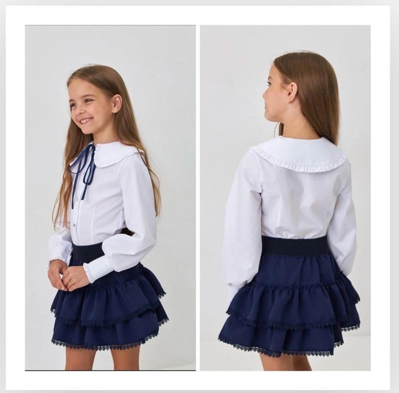 через кнопку купити тільки повна оплата!!! Блуза з воротнічком. Застібається на гудзики, манжети на гудзиках. Стрічка темно-синього кольору - зйомна. Колір : білий. Тканина - котон. Заміри: 122 довжина - 42см, напівобхват грудей - 31см, рукав від плеча - 46см. 128 довжина - 44см, напівобхват грудей - 32см, рукав від плеча - 46см. 134 довжина - 46см, напівобхват грудей - 33см, рукав від плеча - 50см. Мс