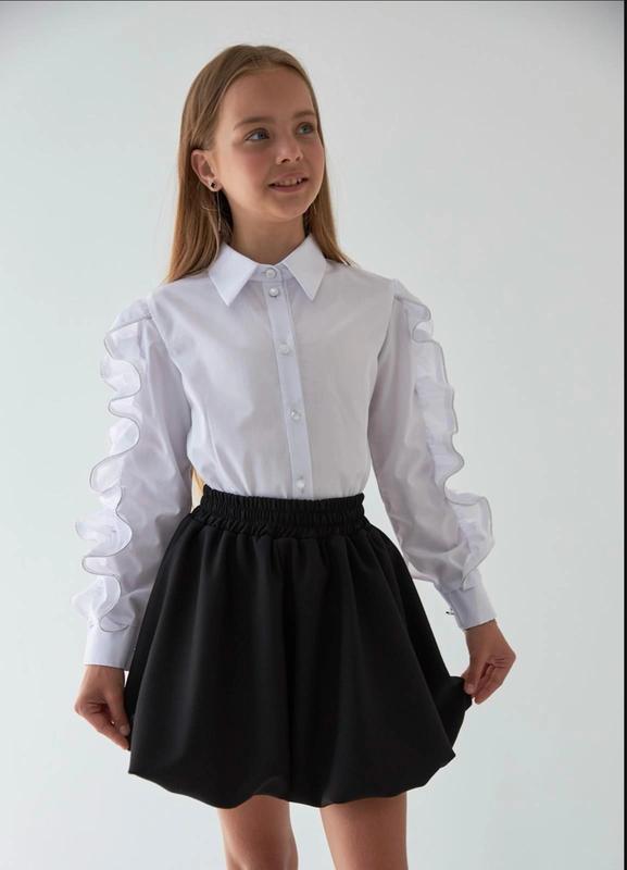 Дуже гарна блуза з пишним рукавом Застібається на гудзики, манжети на гудзиках. Кант на рукавах оздоблений камінчиками. Колір : білий. Тканина - котон. Заміри: 116 довжина - 42см, напівобхват грудей - 34см, рукав від плеча - 43см. 122 довжина - 44см, напівобхват грудей - 35см, рукав від плеча - 45см. 128 довжина - 46см, напівобхват грудей - 36см, рукав від плеча - 47см.