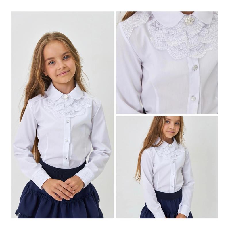 Дуже гарна блуза з прикрасою Застібається на гудзики, манжети на гудзиках. Жабо з брошкою зйомне, пристібається на гудзики. Манжети прикрашені мереживом. Колір : білий. Тканина - котон. Заміри: 116 довжина - 42см, напівобхват грудей - 34см, рукав від плеча - 43см. 122 довжина - 44см, напівобхват грудей - 35см, рукав від плеча - 45см. 128 довжина - 46см, напівобхват грудей - 36см, рукав від плеча - 47см.