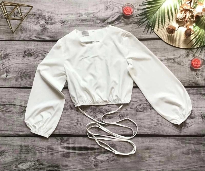 В наявності! Блуза топ із зав'язками Топ по спинці застібається на блискавку. Тканина топ - софт (молочна) Заміри: 134 довжина - 34см, напівобхват грудей - 36см, рукав від плеча - 44см.