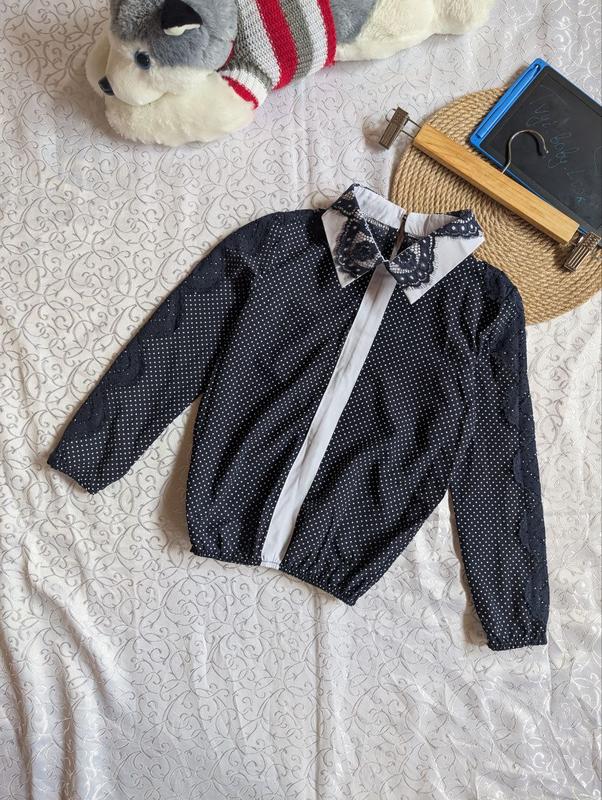 Блуза на дівчинку в горошок зі вставками мережива Бренд: відсутній Стан: ідеал, без бірки Розмір: 10 р (140) Більше фото та заміри можемо надати в особистих повідомленнях 💌