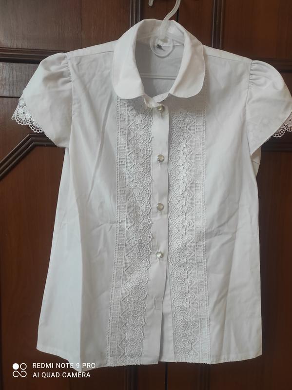 Біла блузка для дівчинки з коротким рукавом прикрашена мереживними вставками на грудях та руеавчиках, закривається на ґудзики-перлинки. Стане основою для шкільних та святкових образів для Вашої доньки ПОГ 44 ПОТ 42 ПОБ 48 Довжина виробу 55 Довжина рукава 14