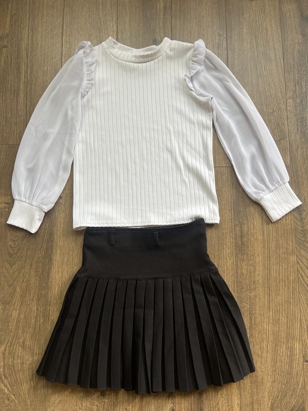 Блуза і юбка на зріст 116-122 Блуза довжина рукава 44 см Довжина 45 см ПОГ 33 см Юбка пот 27 см Довжина 33 см на юбкі є пару маленьких затяжок майже не видно.