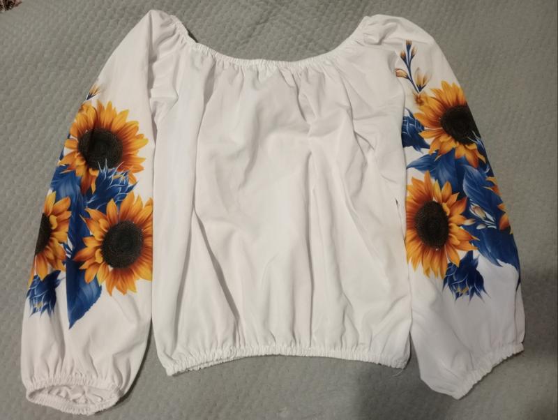отличная блуза, с красивыми рукавами, достаточно красиво выглядит. одевались 2 раза. на резинках. размер указан 158, но можно и меньше