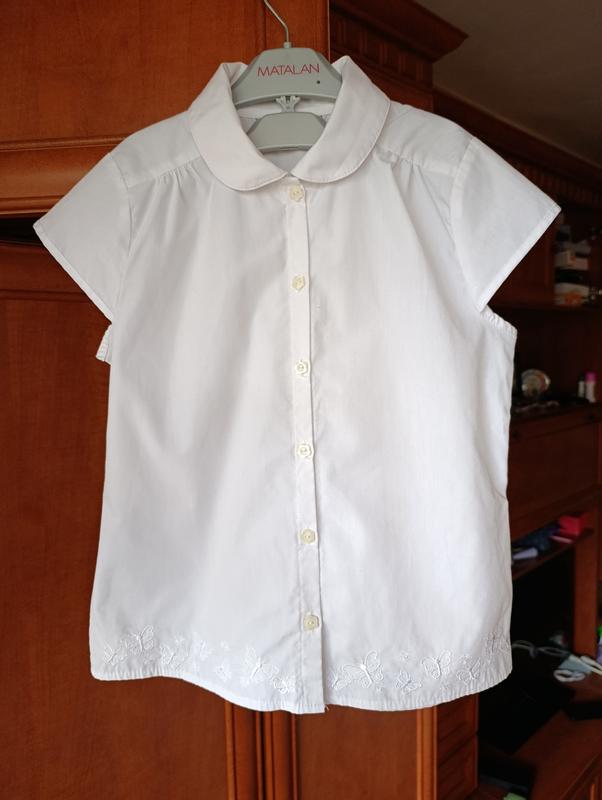 Белая блузка для школы. Производитель George. Длина 49 см, полуобхват груди 38 см. Снизу симпатичная вышивка бабочек.