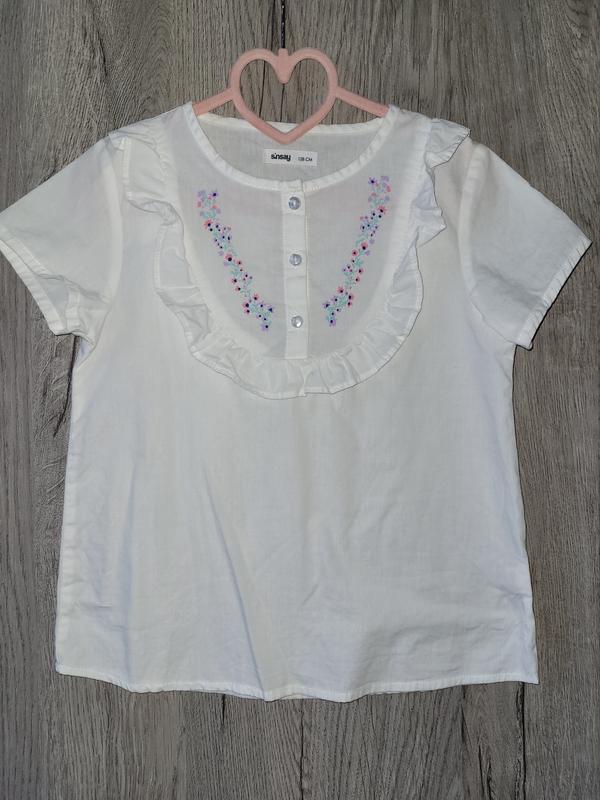 Продам хорошенькую блузку для девочки. Застегивается на 3 пуговицы. Рисунок цветочки. Короткий рукавчик. Длина 47 см, ширина под грудью 36,5 см. Размер 128, но можно носить дольше.