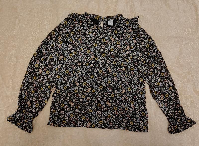 Легкая и приятная на ощупь блузка черная в цветочек для девочки (по бирке на 152 см). Замеры: длина от плеча-53 см длина рукава- 55-56 см полуобхват груди-42 см