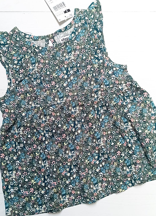 Блузка Gemo 100% вискоза Размер: 8 лет Замеры 📏 Длина 43 см ПОГ 34,5 см Дизайн: Без рукавов, с воланами на плечах и мелким цветочным принтом в зелено-синих и розовых тонах. Модель имеет отрезную талию со сборками, что придает ей свободного силуэта. Материал: Тонкая и легкая ткань, подходящая для летнего сезона. Особенности: По спинке расположена застежка на пуговице.